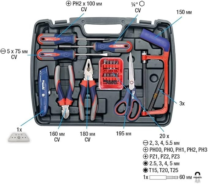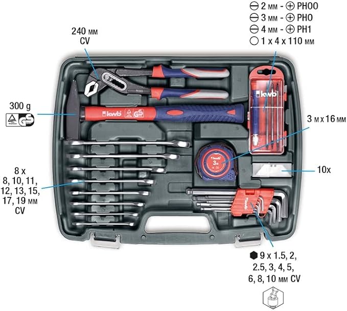 kwb 370730 Werkzeug-Koffer inkl. Werkzeug-Set, 65-teilig, gefüllt, robust und hochwertig, ideal für den Haushalt oder die Garage, im praktischen Kunststoffkoffer
