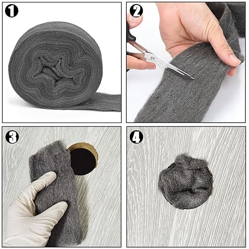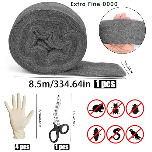 Ziamzra Stahlwolle Gegen Mäuse 8,5M Stahlwolle Wirksam Stahlwolle Fein 0000 Mäuse Stahlwolle 0000 mit Schere Arbeitshandschuhen für Löcher Ritzen Wand Risse Reinigen Polieren Haus Garage Garten