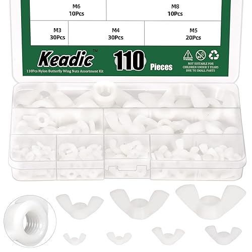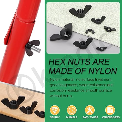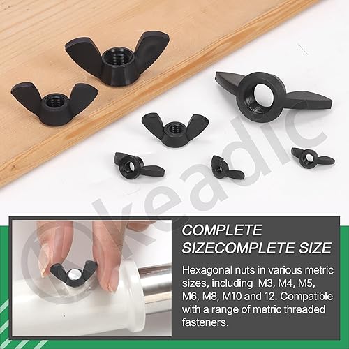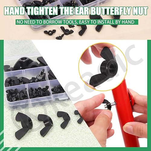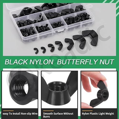 Keadic 110Pcs Nylon Metrische Flügelmuttern Sortiment Set, M3 M4 M5 M6 M8 M10 M12 Hand Twist Festziehen Ohr Schmetterling Mutter Flügelmuttern für Home Building Industry (Black)