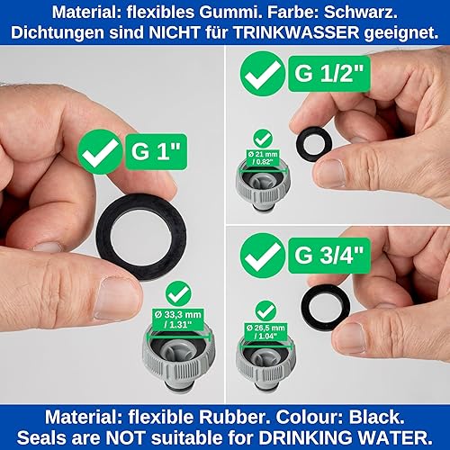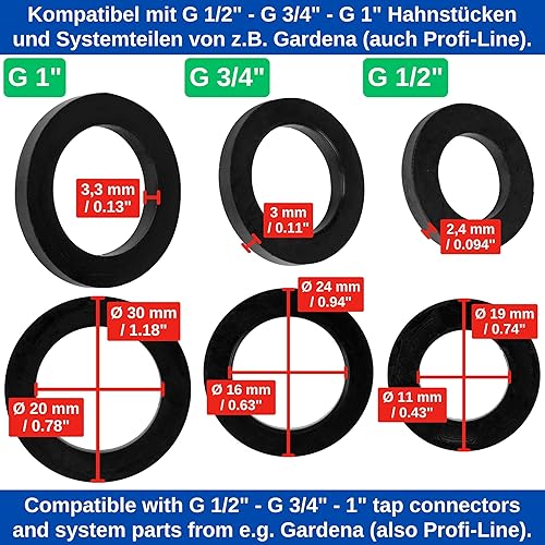 Ersatz Flachdichtungen Set, 75 Stück, für G 1/2' - 3/4' - 1' Garten Stecksysteme, kompatibel mit Gardena 21, 26,5, 33,3 mm Hahnverbinder, Ø 19 x 11, 24 x 16, 30 x 20 mm, aus Gummi, Reparatur Dichtung