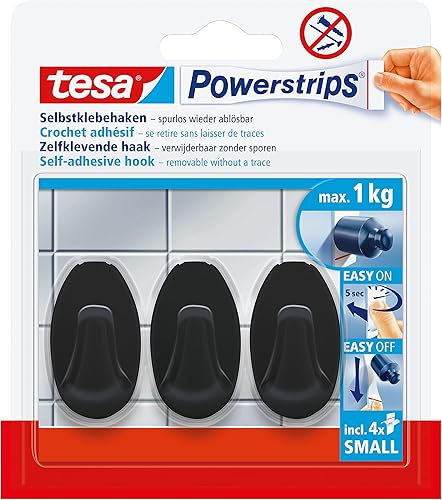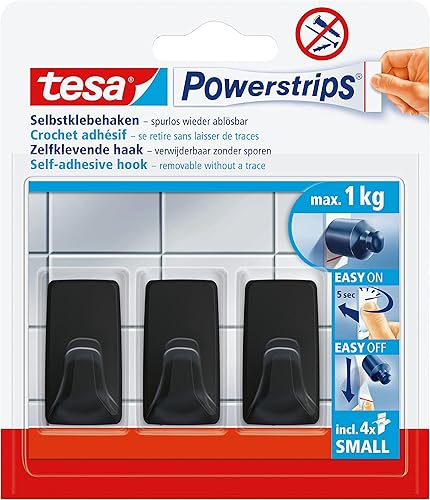 tesa Powerstrips Klebehaken Small Eckig - 3 x selbstklebende Wandhaken - für Kacheln, Glas, Kunststoff und weitere Untergründe - 1 kg Halteleistung - Schwarz