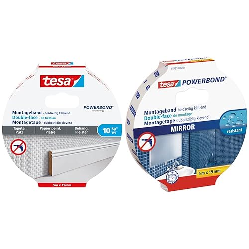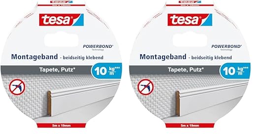 tesa Montageband Tapete&Putz, 10 kg Haltekraft pro Meter - starkes, doppelseitiges Montageklebeband zur Befestigung auf Gips und Tapeten - 5 m x 19 mm