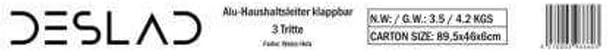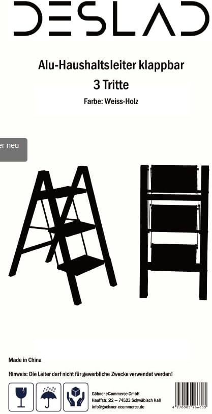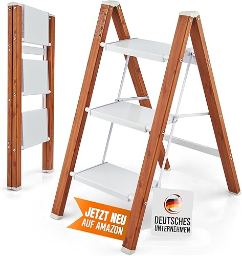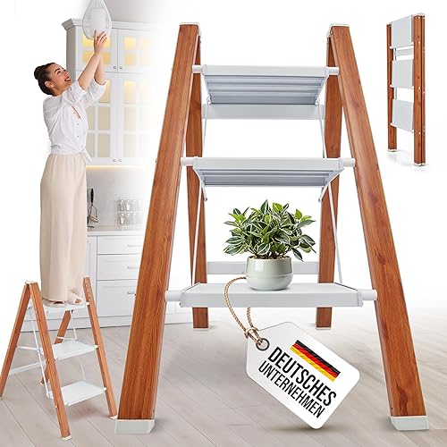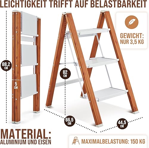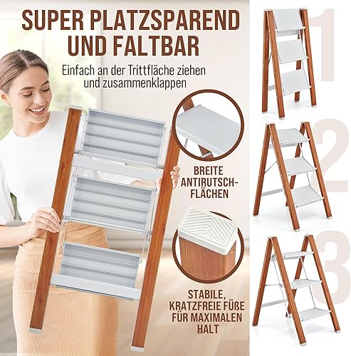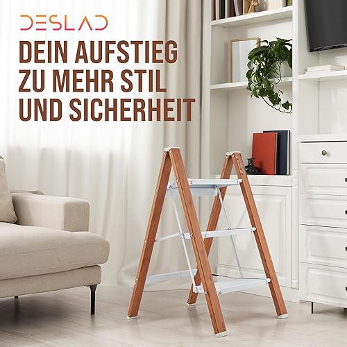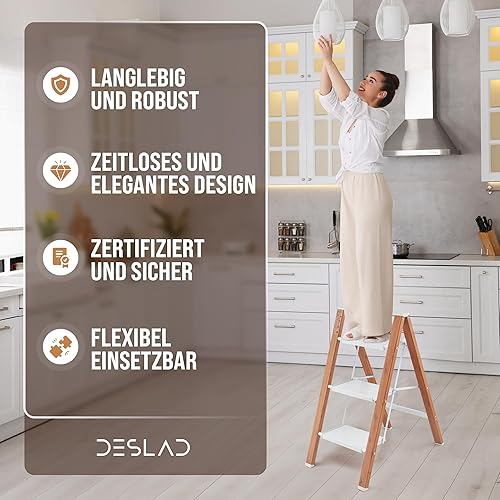 DESLAD Trittleiter 3 Stufen klappbar [Aluminium] Holzoptik Weiss Design leicht bis 150kg | für Haushalt Garten und Camping | Tritthocker Klapphocker