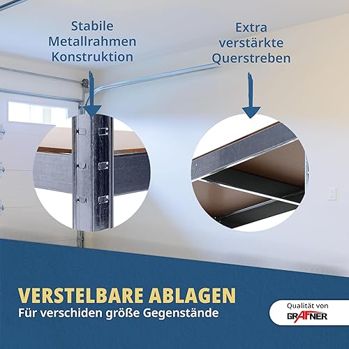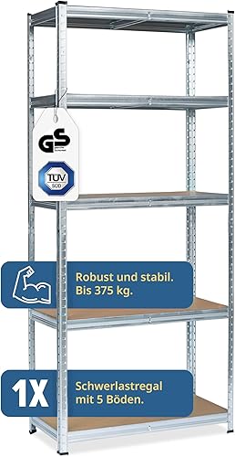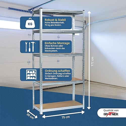 Grafner Schwerlastregal mit 5 Böden aus MDF, maximale Belastung 375 kg, abgerundete Ecken, 75x30x172 cm, Steckregal, Lagerregal Kellerregal