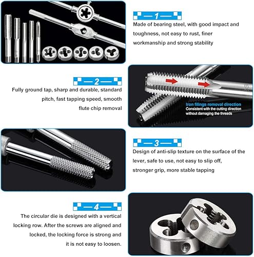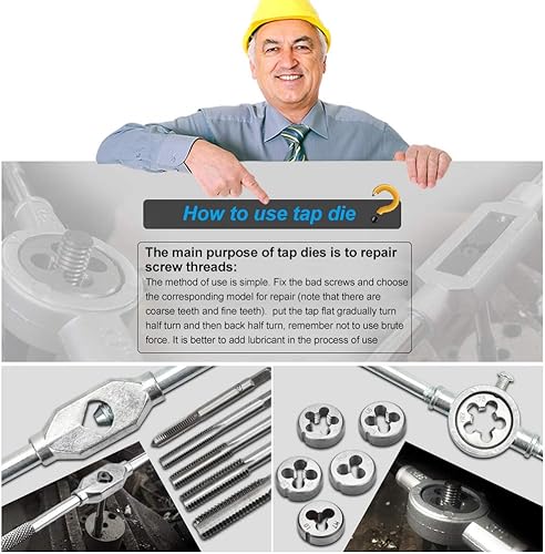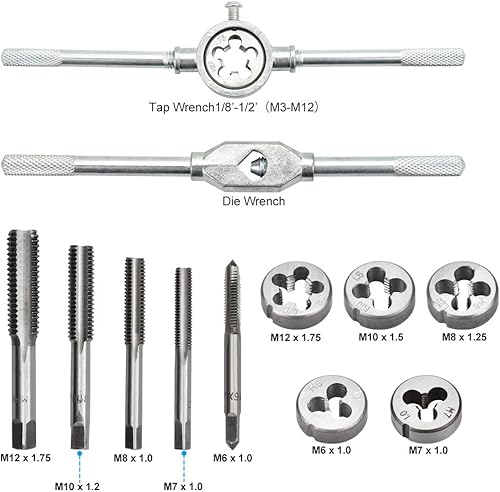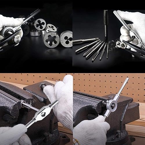 BUZIFU 12 Teilig Gewindeschneidsatz Metrisch Profi Gewindeschneider Gewindebohrer Set mit Schraubenschlüssel Schneideisen Kohlenstoffstahl Handgewindebohrer für Innengewinde Außengewinde