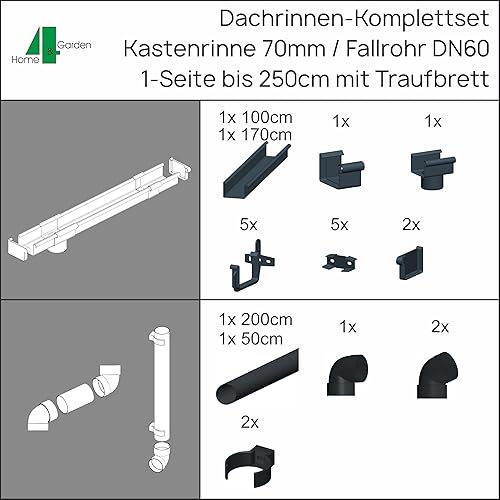 Dachrinne Kastenrinne RG 70 Komplettset mit Fallrohr bis 750cm | Typ 200 Fallrohr DN 60 | Kunststoff PVC Anthrazit | 4 Home & Garden (Dachlänge bis 250cm)