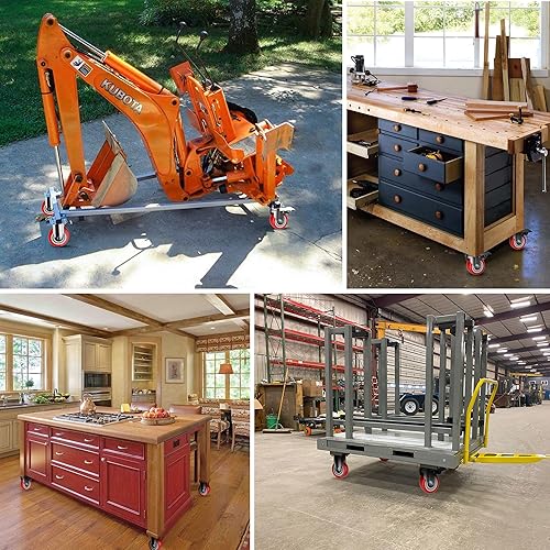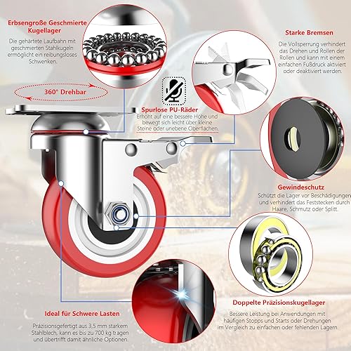 Deutnart 100mm Transportrollen mit Bremse, Extra Schwerlastrollen 700kg Tragfähigkeit, Langlebige Schmutzabweisende Lenkrollen (3. Generation, Verbesserter Premium Stahl, Solides Rad), 4er Pack, Rot