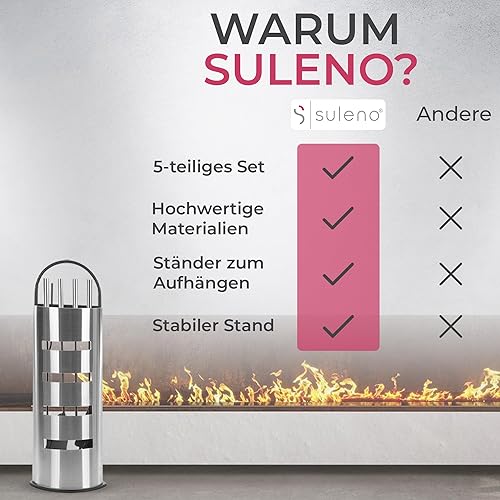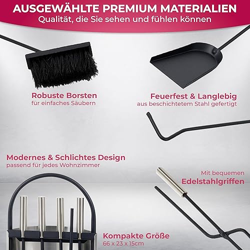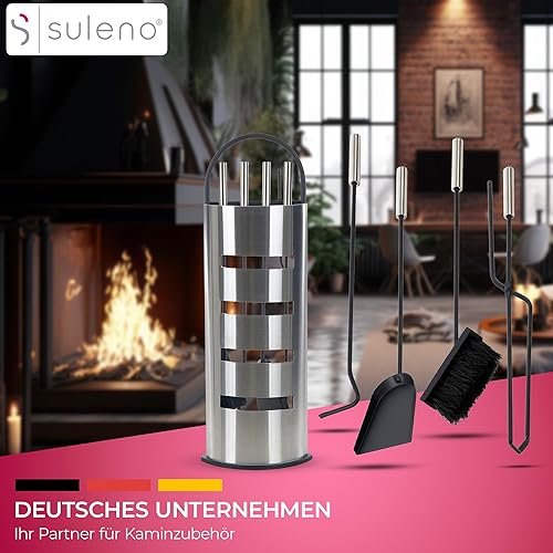 SULENO Kaminbesteck LONDON 5-teilig Kamingarnitur mit Ascheschaufel Besen Schürhaken, Kaminset & Halter, Ofenbesteck Edelstahl