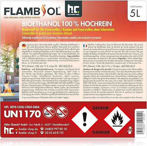 10 L FLAMBIOL® Premium Bioethanol 100% für Ethanol Kamin, Ethanol Feuerstelle, Ethanol Tischfeuer und Bioethanol Kamin (2 x 5 L) von Höfer Chemie