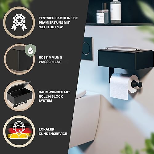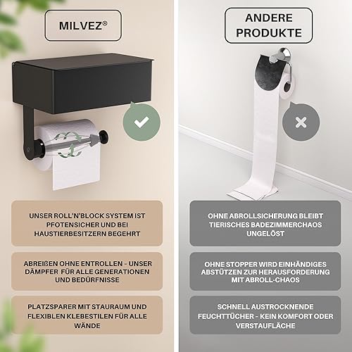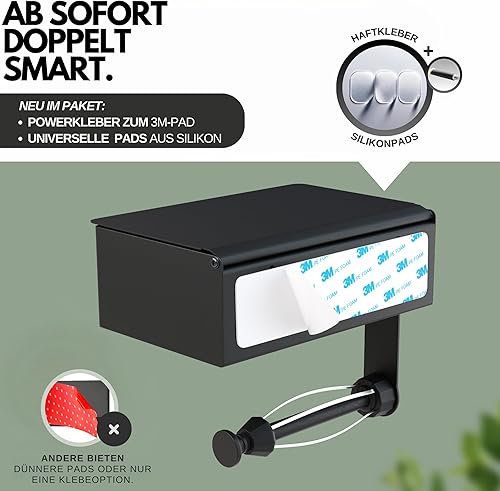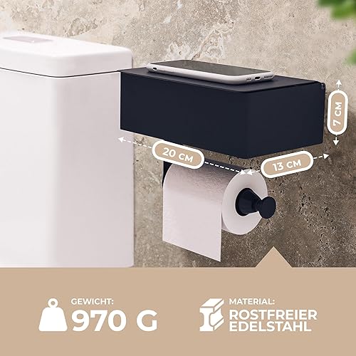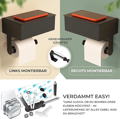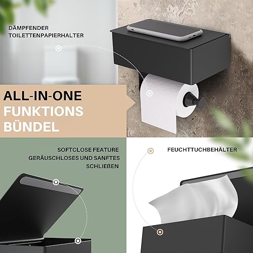 MILVEZ® - Klopapierhalter ohne Bohren, Toilettenpapierhalter mit Feuchttücherbox & Dämpfer, Klorollenhalter Edelstahl Schwarz, WC-Papierhalter, Ablage