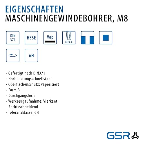 GSR PROFI Maschinen-Gewindebohrer M8, Gewindeschneider für Edelstähle DIN 371, HSSE-VAP Metallbohrer, Durchgangsloch Kernlochbohrer, Form B, verstärkter Schaft für metrische Gewinde
