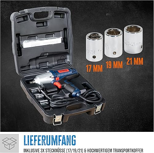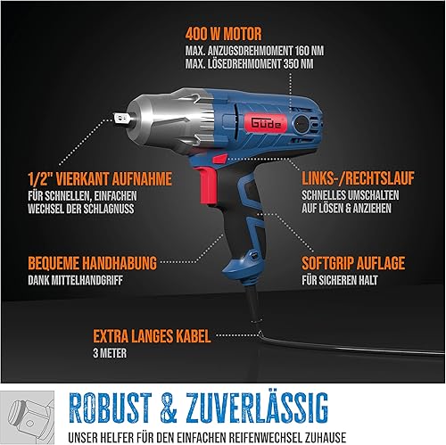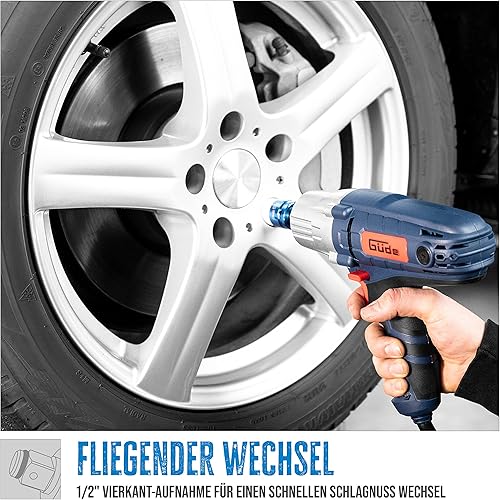 Güde Schlagschrauber ESS 350 (450 W, GS-geprüft, Drehmoment 350 Nm, Rechts-/Linkslauf, 3200 1/min, 1/2' Werkzeugaufnahme, inkl. 3 Stecknüsse (17/19/21) aus Chrom-Vanadium-Stahl & Transportkoffer)