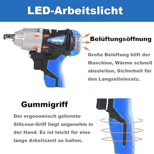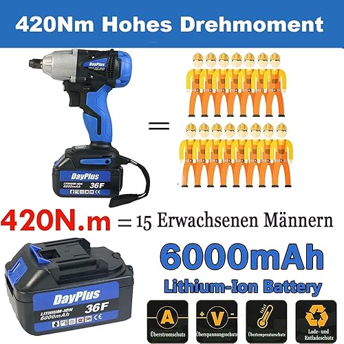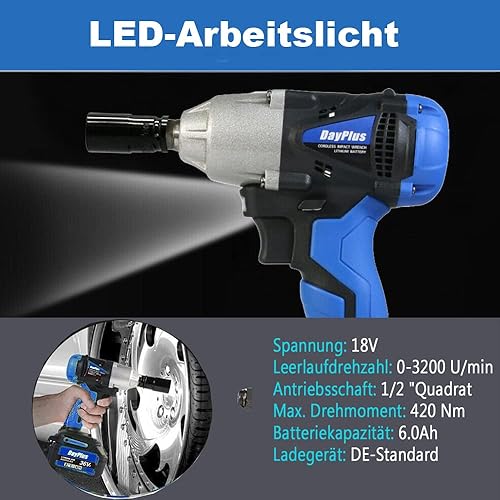 DayPlus Akku Schlagschrauber Reifenwechsel, Akku Drehschlagschrauber 1/2 Zoll Vierkantschlüssel mit Akku 6.0Ah 18V, Max. Drehmoment: 420 Nm, 2-Gang, Vorwärts & Rückwärts Funktion, LED Leicht - 1 Akku