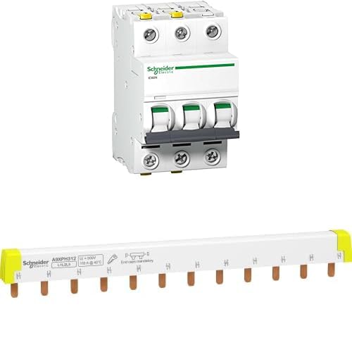Bundle aus Schneider Electric A9F03325 Leitungsschutzschalter ACTI9 IC60N 3P 25A B, Weiß + Schneider Electric A9XPH312 Phasenschiene Steg, ablängbar, 3P, 12 TE, 100A