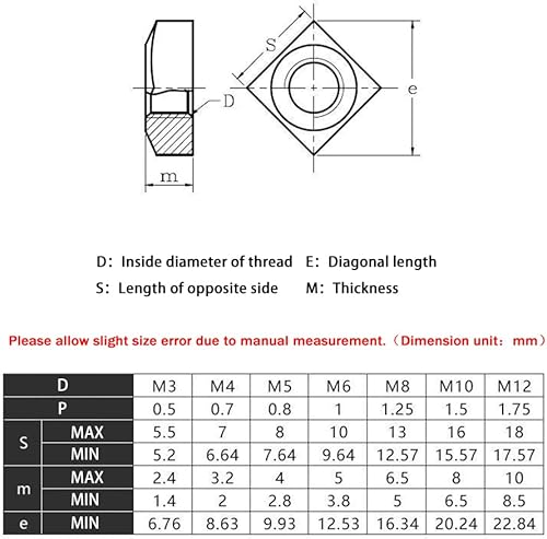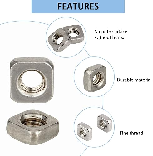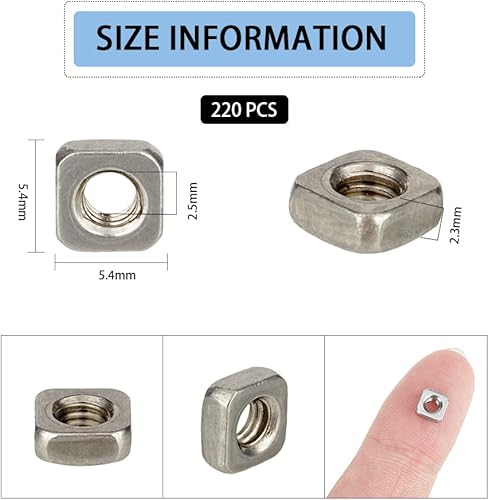 SUPERFINDINGS 220 Stück quadratische Muttern M3 Edelstahl, dünne Vierkantmuttern, Einsatz 5,4 mm, Sicherungsscheiben, Loch: 2,5 mm