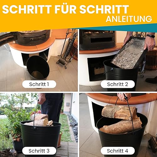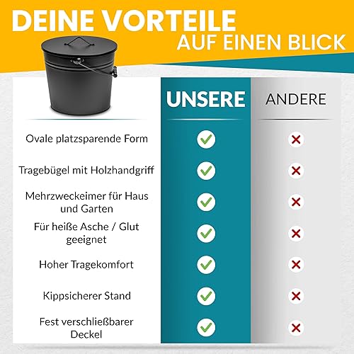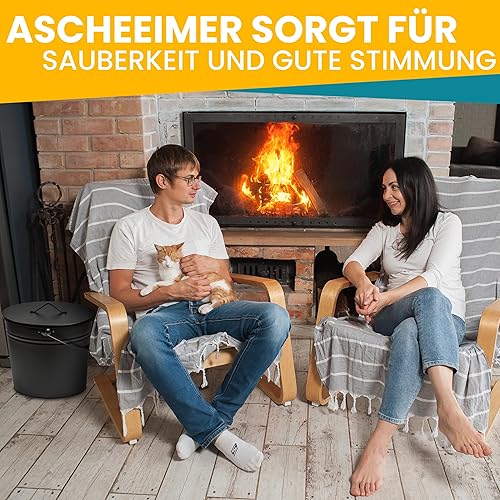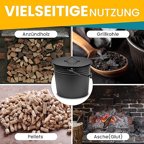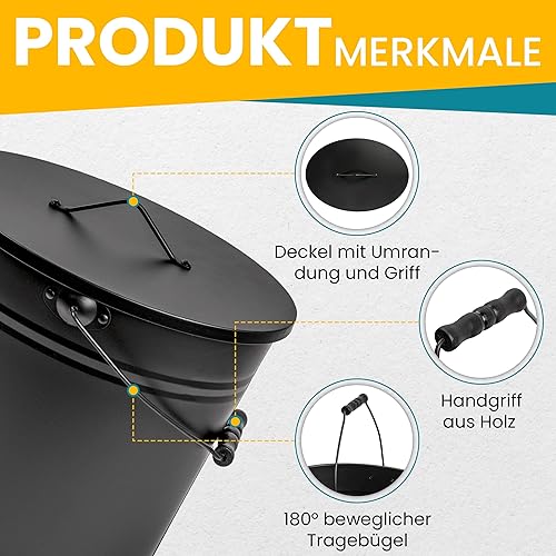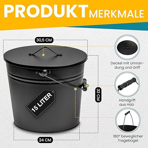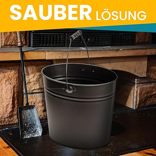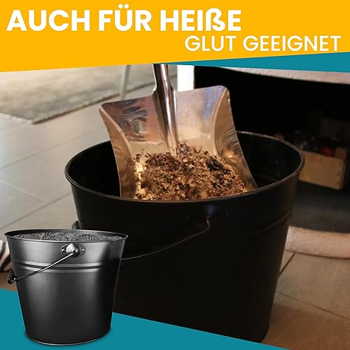 ORA-TEC Ascheeimer mit Deckel - 15 Liter 24 x 33 x 30,5 cm - Kohleeimer Kamineimer in matt Schwarz mit Deckel und Tragegriff für Kohle und Asche - Kamin, Ofen, Grill