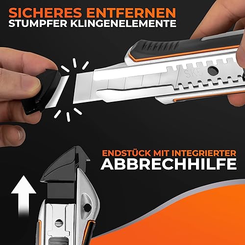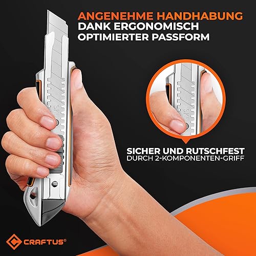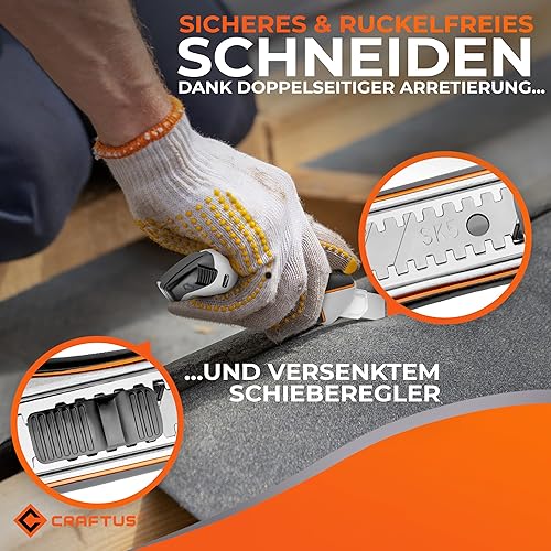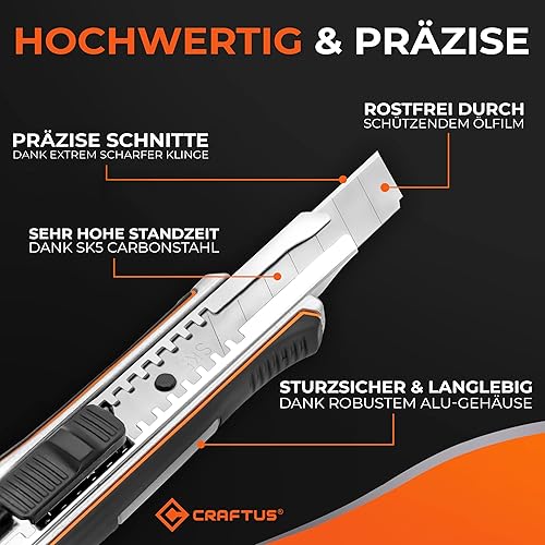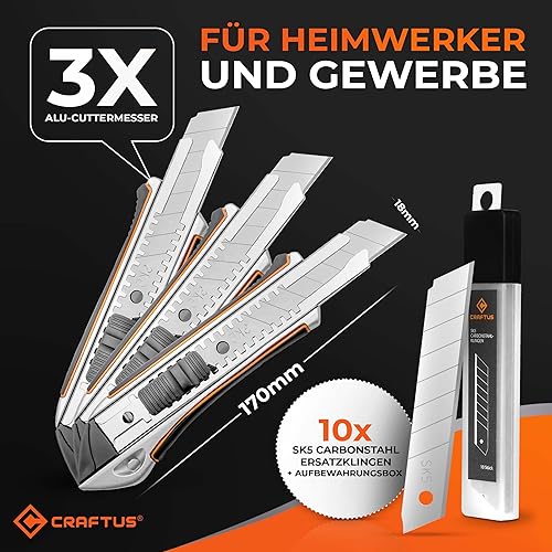 CRAFTUS® Profi Cuttermesser Set [3 Stück] aus Aluminium für Maximale Lebensdauer, Robuste Teppichmesser inkl. 10 SK5 Carbonstahl Abbrechklingen 18mm, für Heimwerker & Gewerbe