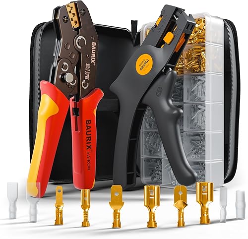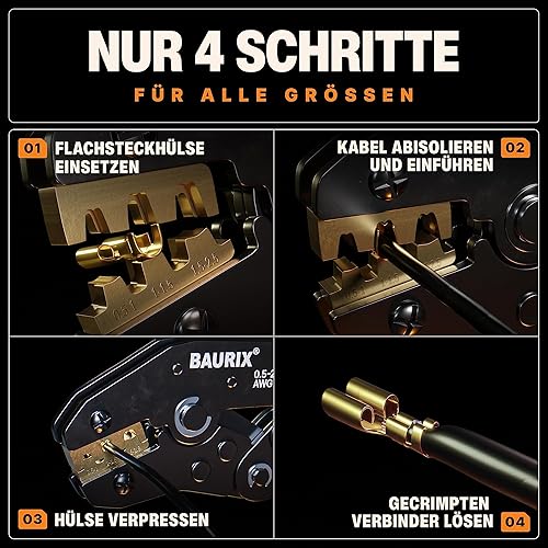 BAURIX® Crimpzange inkl. 300 Stück Flachsteckhülsen Set I Krimpzange für 0,50-2,50 mm² Steckverbinder I Crimpzangen Tool, Crimp Zange, Flachsteckhülsenzange, Crimpwerkzeug