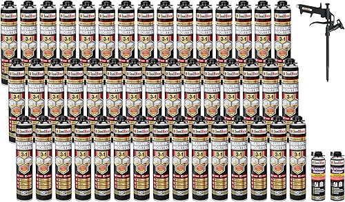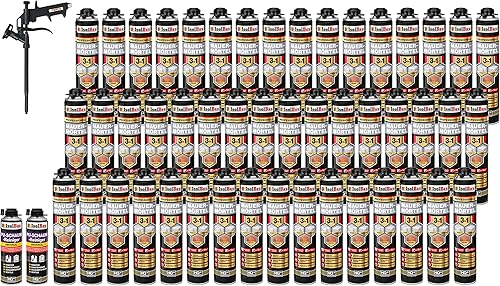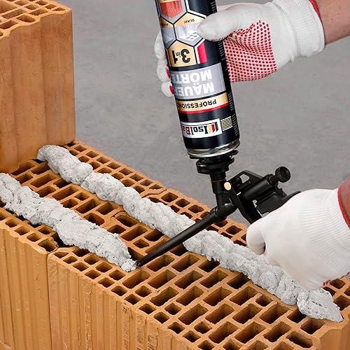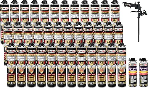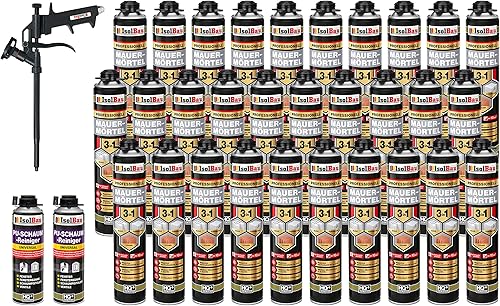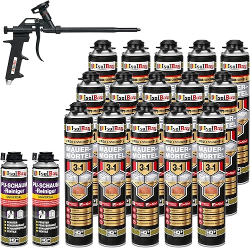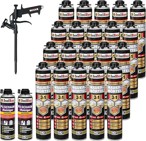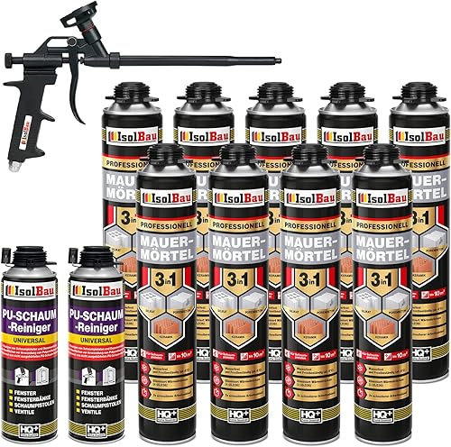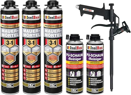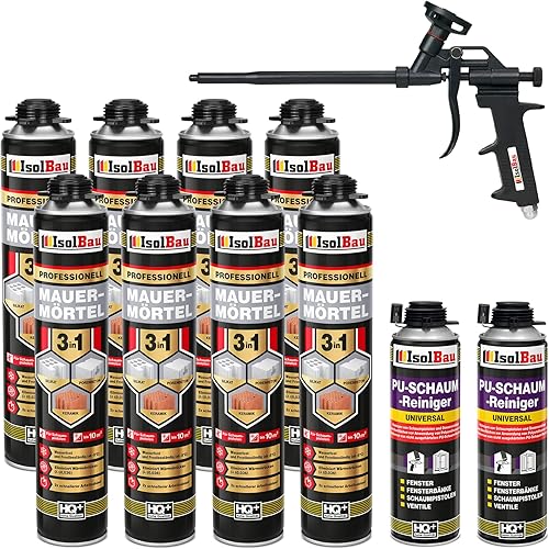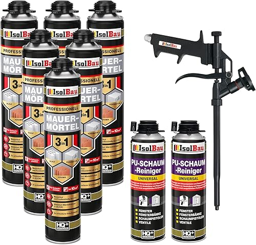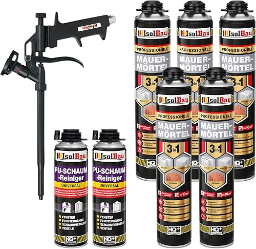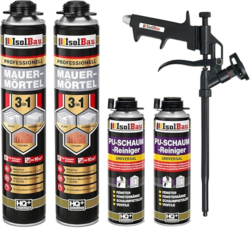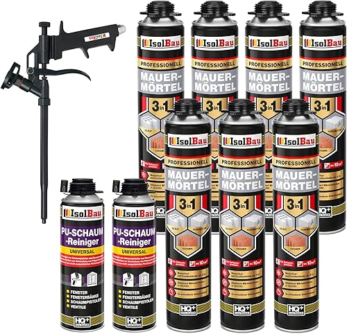 Isolbau Mauermörtel Set: 4x 750 ml PU-Mörtel 2x 500 ml Pistolenreiniger 1x Teflon Schaumpistole, PU-Reiniger, Montageschaum, Pistolenschaum