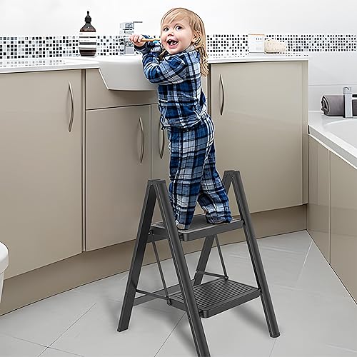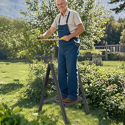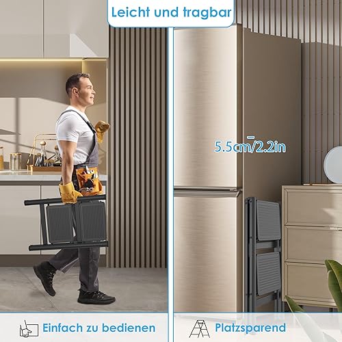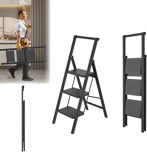 LARS360 3 Stufen Leiter Klappbar mit Handlauf, rutschfeste Haushaltsleiter, Klapptrittleiter für Haushalt, Büro, Tragbar und Stabil, Belastbar bis 270KG, Schwarz