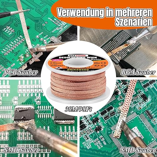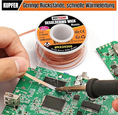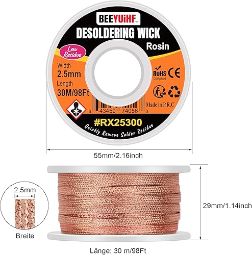 BEEYUIHF Entlötlitze, 30M - 98ft Entlötdraht, 2.5mm No-Clean Löt Entlötlitze, Dochte Litzen zum Entlöten, Entlötdocht zum Entfernen des Lötzinns zum Zerlegen elektrischer Komponenten 30 m Spule