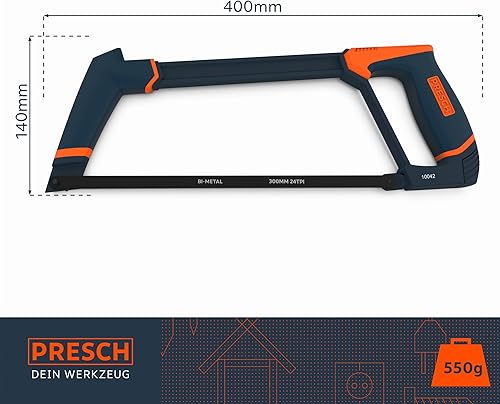 Presch Metallsäge 300mm lang - Bügel-Säge für Metall, Aluminium und Plastik - Sägeblatt wechselbar auf 45° - Profi Handsäge, Bügelsäge