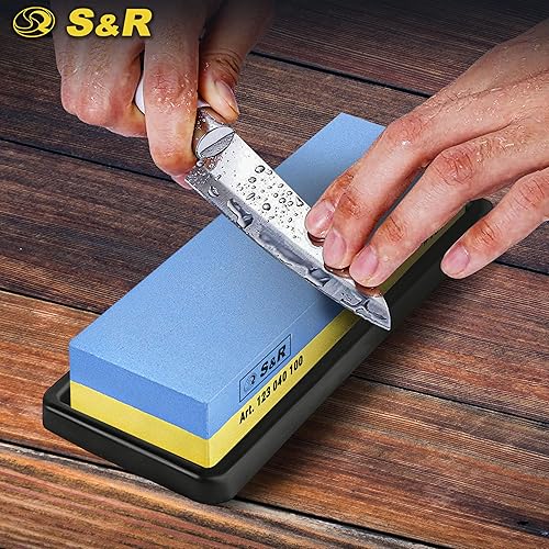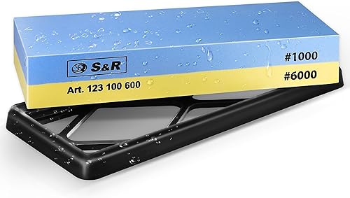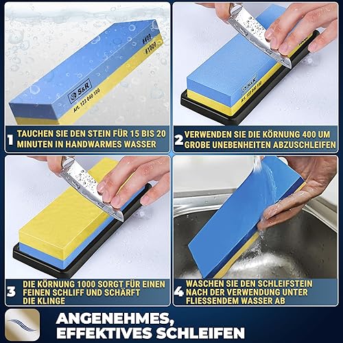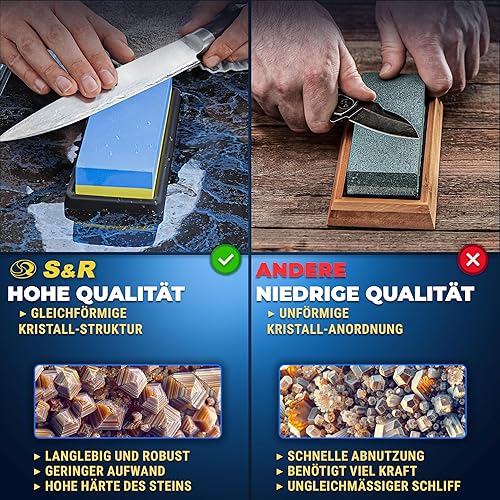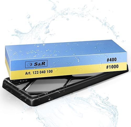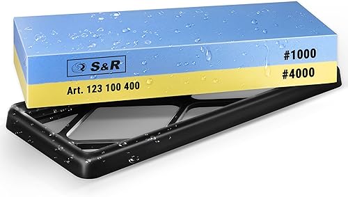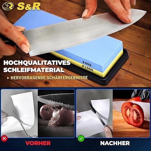 S&R Doppelseitiger Schleifstein 400/1000 - Korund - Premium Wetzstein & Messerschärfer Set, rutschfester Silikon-Halter, Schleifhilfe, präzises Schärfen & Schleifen aller Klingen