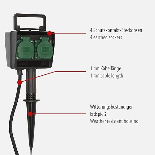 Brennenstuhl Garten-Steckdose/Außensteckdose 2-Fach mit Erdspieß (witterungsbeständiger Kunststoff, Steckdose für außen mit wasserfestem Gehäuse, 1,4m Kabel) schwarz