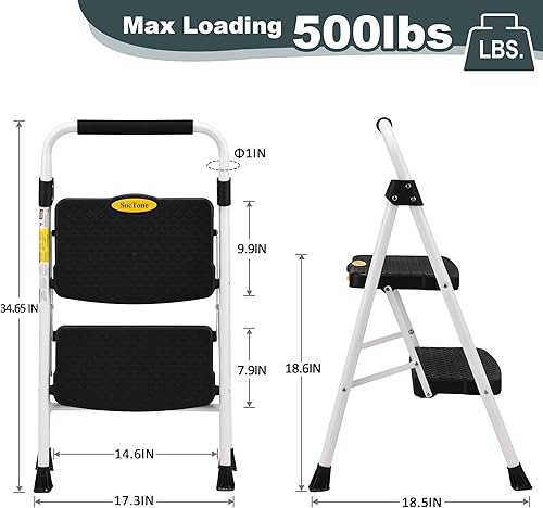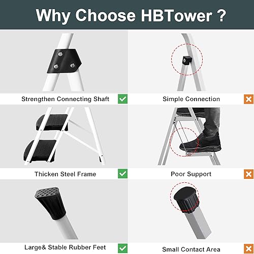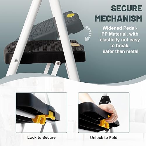 HBTower Leiter 3 Stufen, Klappstufen mit Breitem Anti-Rutsch-Pedal, Stabiler Praktischer Handgriff, Leichter Tragbarer Stahl-Tritthocker, Weiß