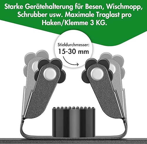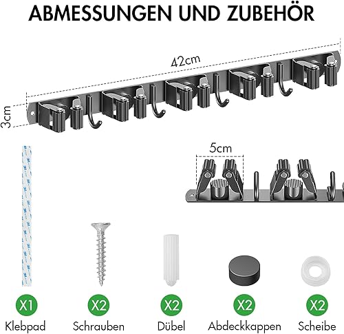 Radikor Besenhalterung Wand, Selbstklebender Besenhalter mit 4 Halter und 3 Haken, Edelstahl Gerätehalter Schraubbar, Gartengerätehalter Gartengeräte Halterung, Besen Mop Halter, Schwarz