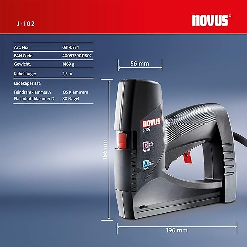 Novus Elektrotacker J-102, Unterlademechanik, Auslösesicherung, Klammernanzeige, zum Polstern & Befestigen von Folie