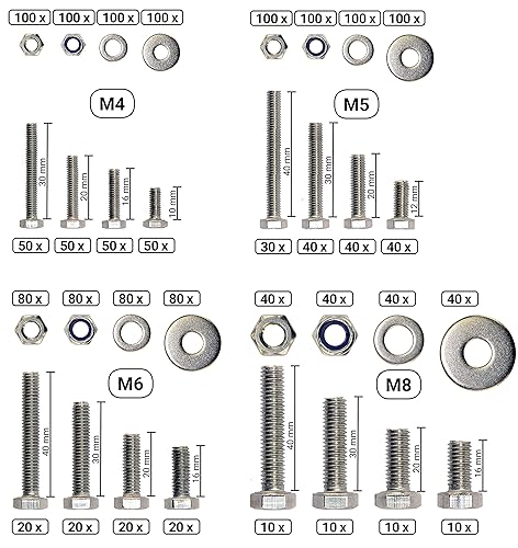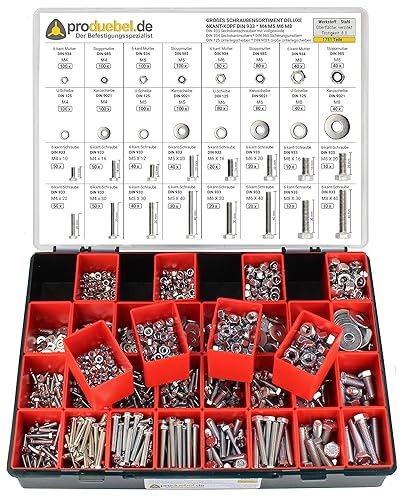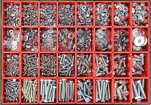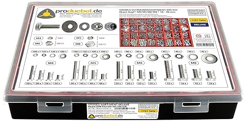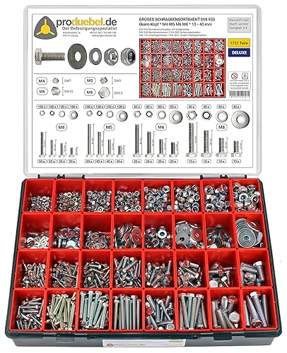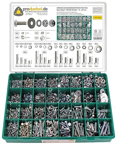 Großes Schrauben-Sortiment DIN 933 M4/M5/M6/M8 Stahl verzinkt (DIN933+934+985+125+9021) 1751-tlg (Standard-Box)