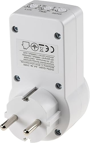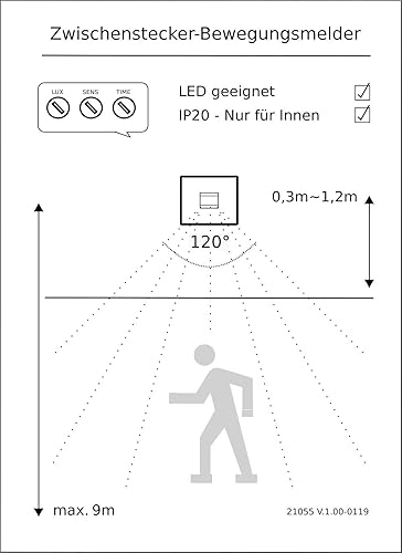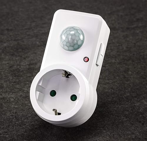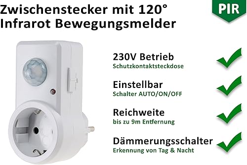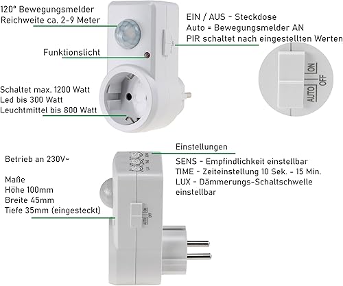 ChiliTec Steckdose mit Bewegungsmelder 120° 9m Reichweite 1200W 230V Zwischenstecker Schaltzeit regelbar 10sek.-15min Timer Empfindlichkeit einstellbar Weiß