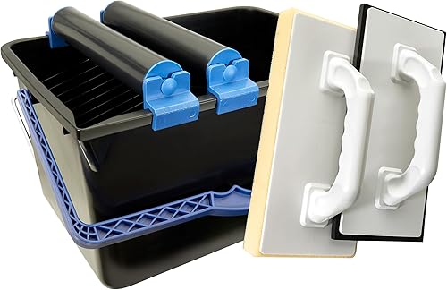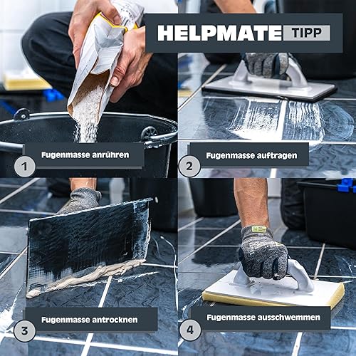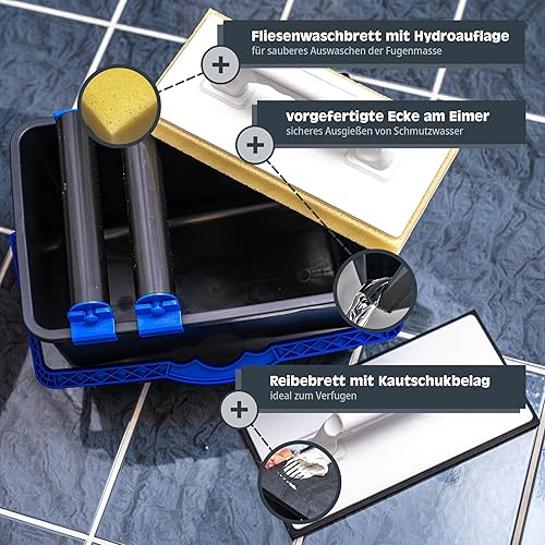 HELPMATE Fliesenwaschset 5-teilig 12 Liter Kunststoff Eimer, Doppelrollenaufsatz, Fliesenwaschbrett und Verfugbrett Made in Germany