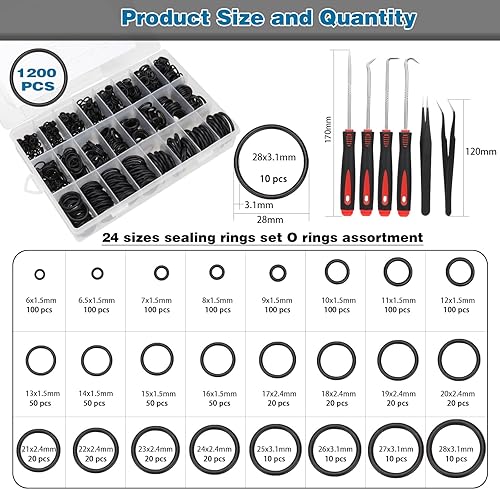 Fomiata 1200-teiliges O-Ring-Set, 24 Größen, Gummi-O-Ring-Set, Dichtungsscheibe mit 4 Haken und 2 Pinzetten,O-Ring Seals Made of NBR for Sanitary, Syphon, Sodastream and Cistern (1200)