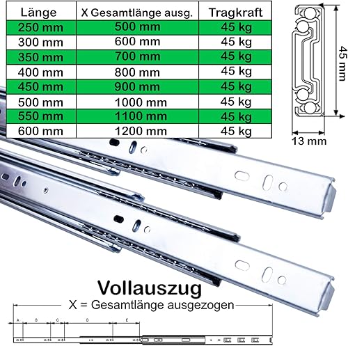 2 x Schubladenschienen Teilauszug Rollenauszug Kugelführung Schienensystem (1 Paar) | NUT 27 mm | Länge 438 mm | STAHLIA®