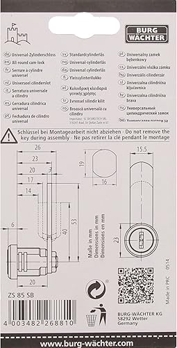 Burg-Wächter 26881 Universalzylinder, Ersatzzylinder für Briefkästen/Spinde/Schaukästen, Scheibenzylinder mit 2 Wendeschlüsseln, ZS 85 SB