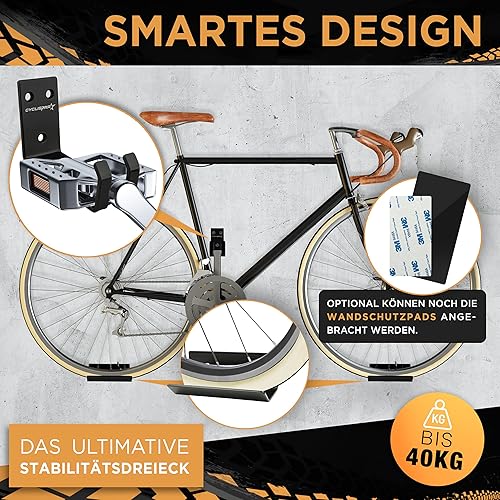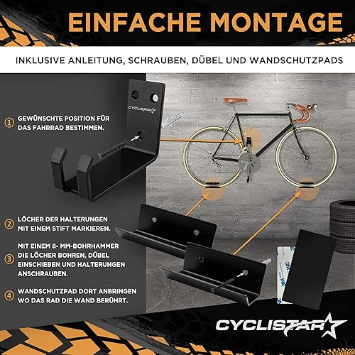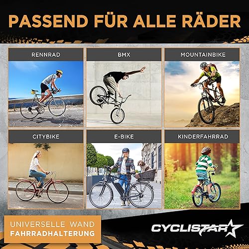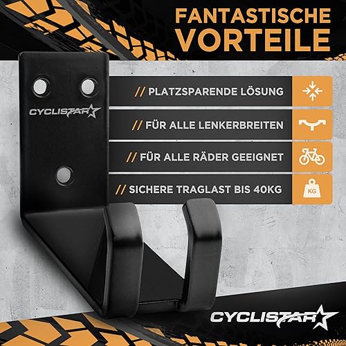 CYCLISTAR Fahrrad Wandhalterung bis 40kg − Robuste Fahrradhalterung Wand für MTB, Rennrad, E-Bike − Fahrradhalter Wand Pedalaufhängung +2X Stützwinkel