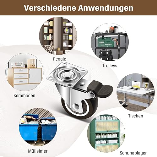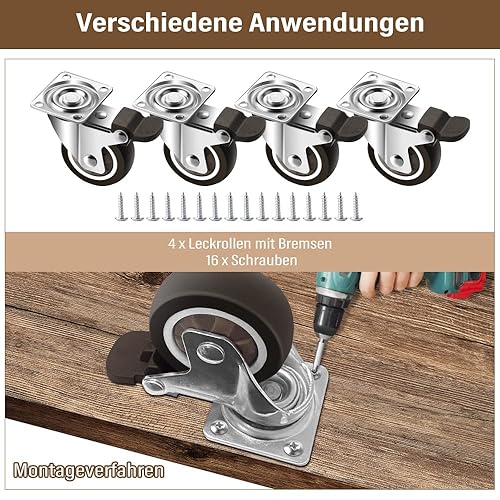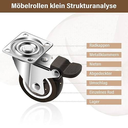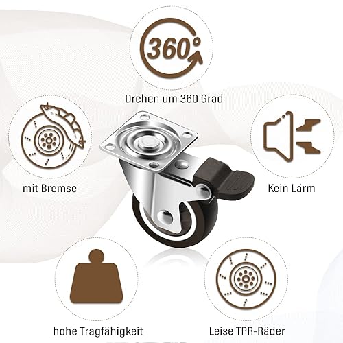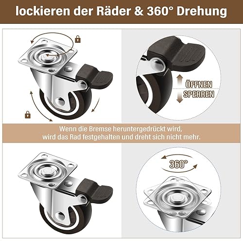 4 Stück Möbelrollen 50mm, Transportrollen mit Bremse bis 100 kg, Schwerlastrollen für Möbel mit Bremsen, 360° Schwerlast Lenkrollen für Strandkorbrollen, Lenkrollen klein, (16 Schrauben)