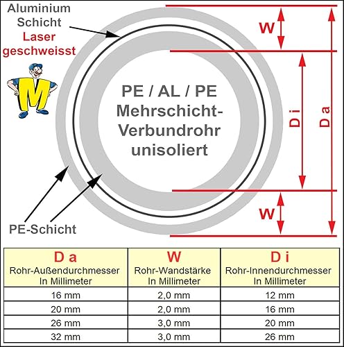 50 Meter Profi-Qualität Mehrschichtverbundrohr Außendurchmesser 16,0 x Wandstärke 2,0 mm rot isoliert für Trinkwasser Rohr Leitung Heizung Kühlung Fußbodenheizung