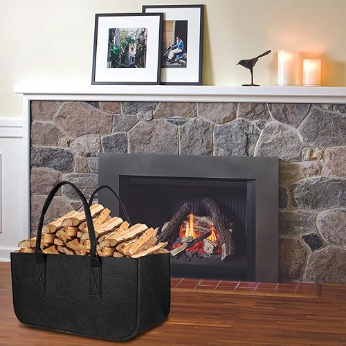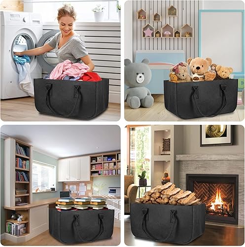AiQInu Brennholz Filztasche Holzkorb für Kaminholz, Faltbar Feuerholzkorb Schwarz Kaminholztasche Holztasche 50x25x25cm, Einkaufskorb Shopper Filztaschen Aufbewahrungskorb für Holz, Zeitungen