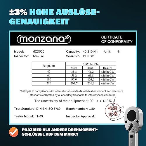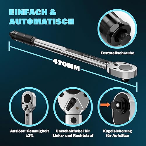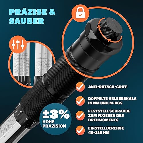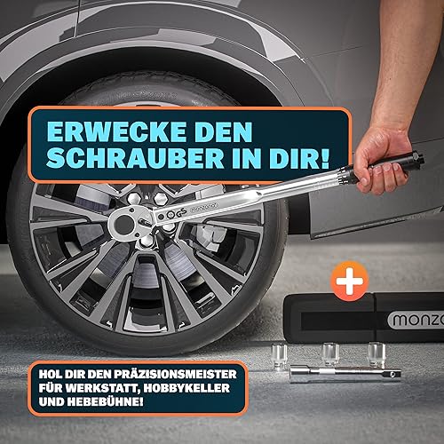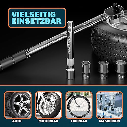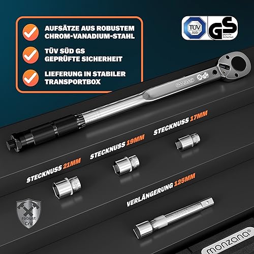 Monzana® Drehmomentschlüssel 6tlg. Set 40-210Nm TÜV Süd GS 1/2' Zoll CrV +/- 3% Toleranz Wende Ratschenkopf inkl. 3 Stecknüsse 17, 19, 21mm Verlängerung inkl. Koffer Auto Motorrad