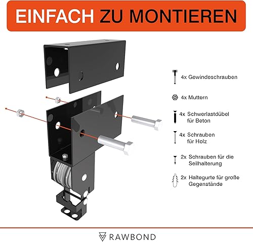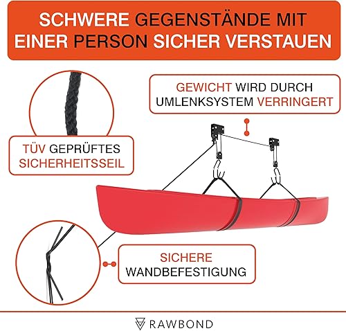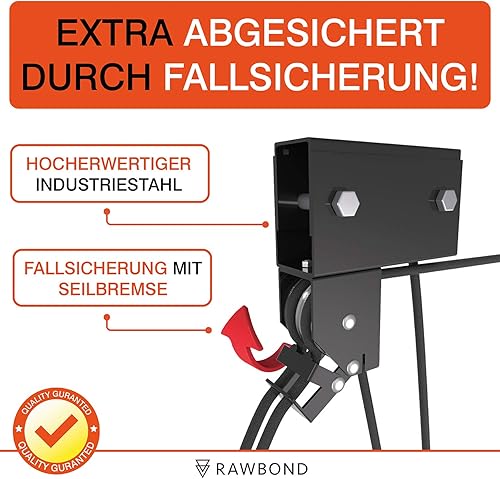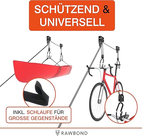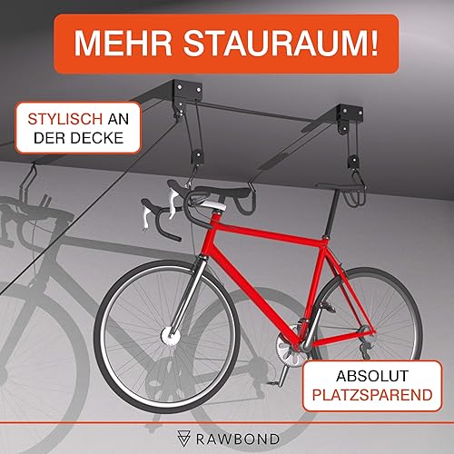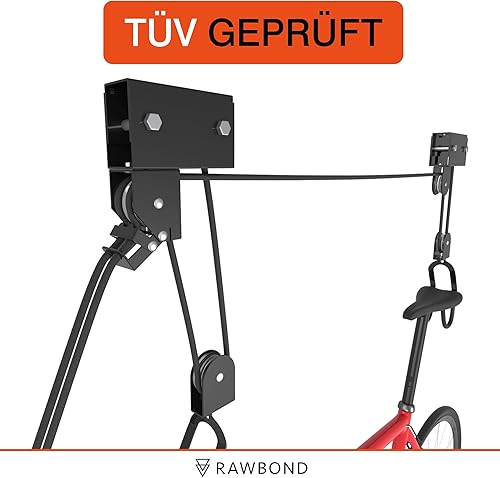 RAWBOND Fahrradlift mit Flaschenzug - Universal Seilzugaufhänger Fahrrad bis 57 kg - Praktische E-Bike Aufhängung Garage - Deckenaufzug Fahrrad mit Notfallbremsmechanik - Schwarz