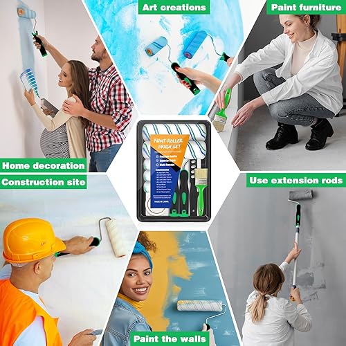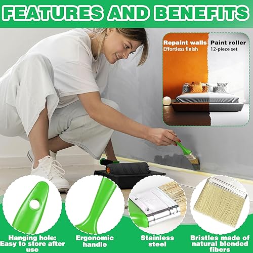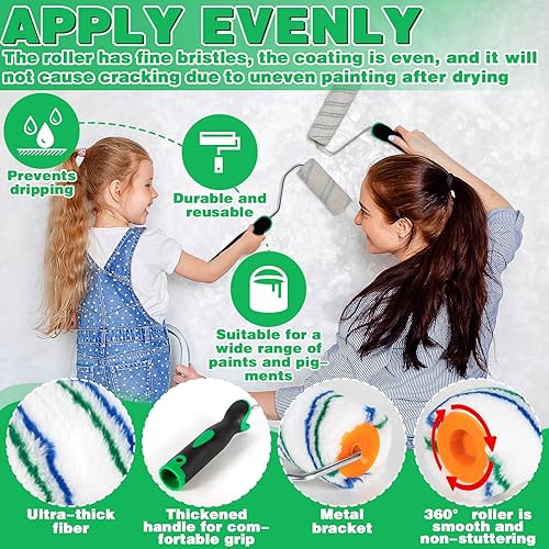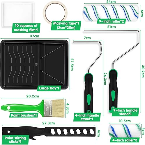 JEDWKFA 12 Stücke Farbroller Wandfarbe, Farbroller Kommt mit Bürste, Staubdichter Folie, Rührer, Farbwanne, Wandfarbe Roller, Farbroller Groß, Farbroller Set, Maler Set für Wand, Grün