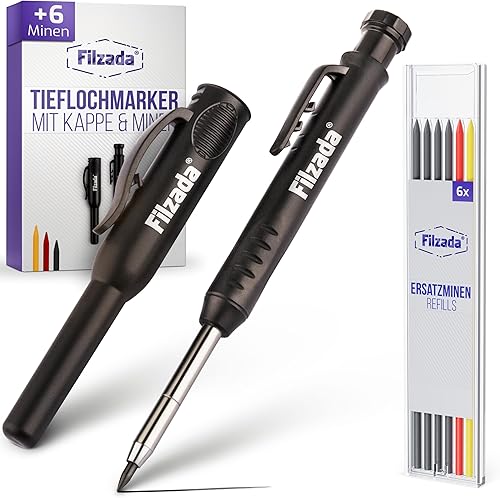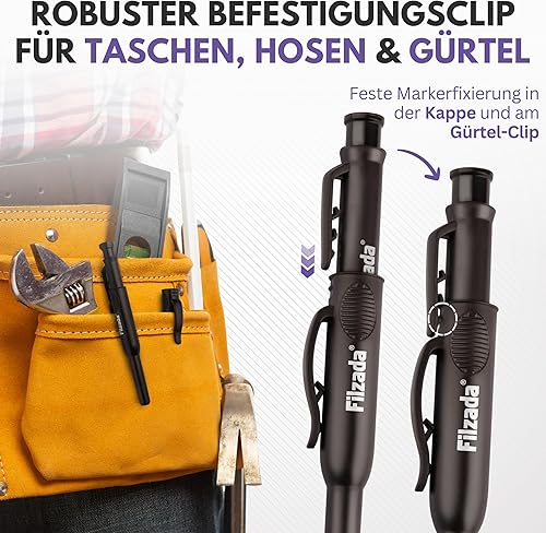 Filzada® 2x Tieflochmarker mit 24 Extraminen - in 3 Farben- Zimmermannsbleistifte mit Köcher/Kappe - Bohrlochmarker - Bleistift Baustelle - Markierstift - Tieflochmarker Bleistift - Markierstifte