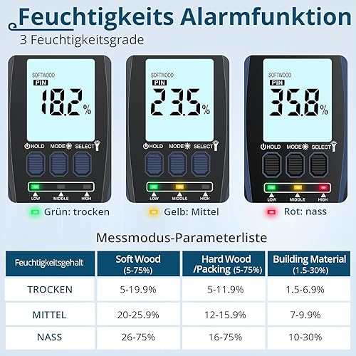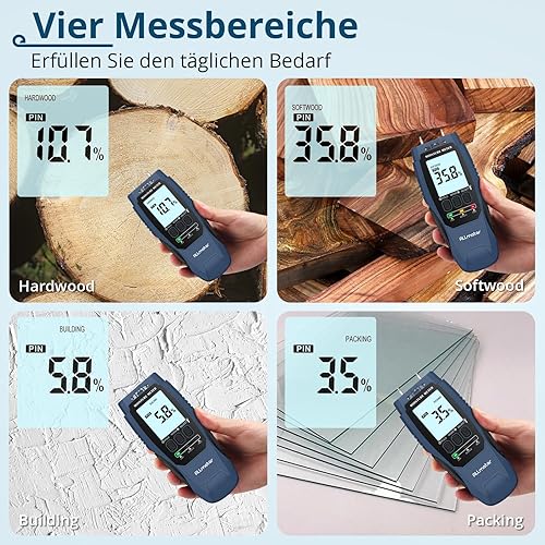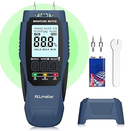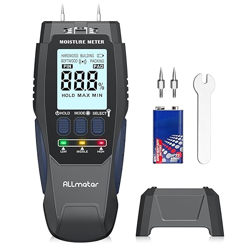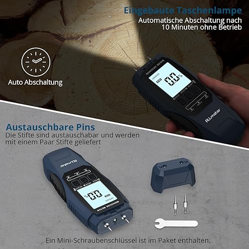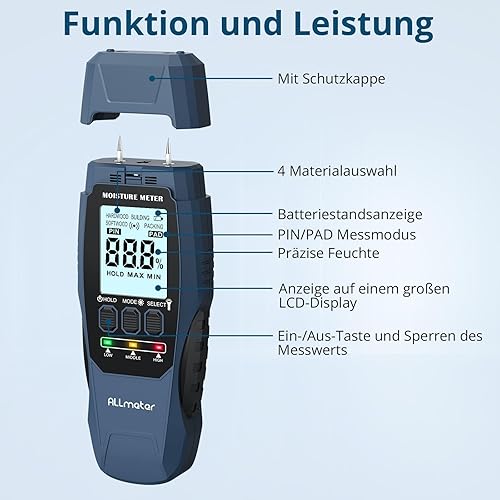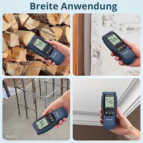 ALLmeter Feuchtigkeitsmessgerät Wand 2-in-1 (Pin/Pinless) mit LCD-Display, Tonalarm und 4 Messmodi Holzfeuchtemessgerät für Baustoffe, Wände, Holz, Metall, Mauerwerk, Trockenbau, Boden und DIY
