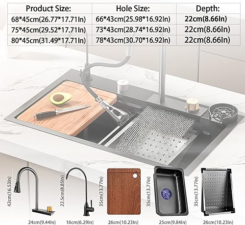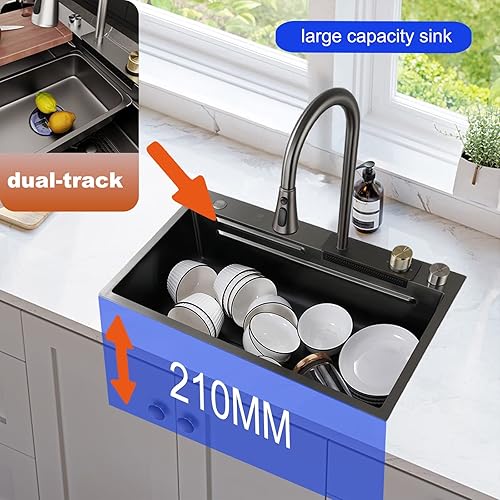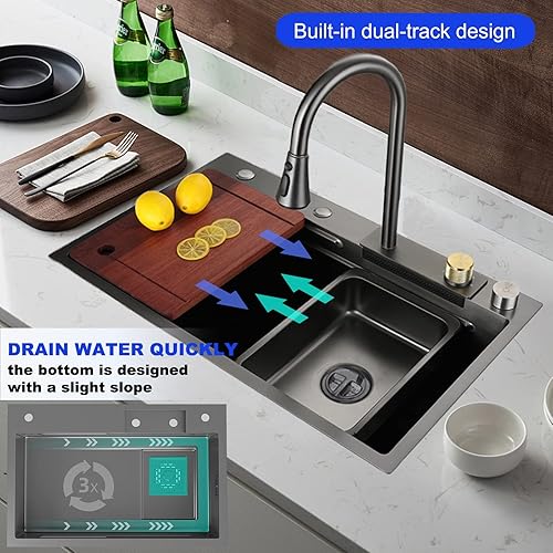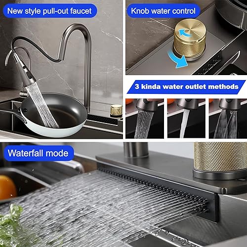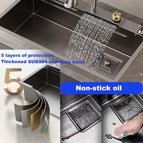 Spüle, Einzelbeckenspüle aus Edelstahl 304, Küchenspüle, schwarzes Quadrat, Flying Rain-Spüle, Flying Rain-Wasserfall, Unterbau-Arbeitsplatzspüle mit herunterziehbarem Wasserhahn, Tassenwaschmaschine,