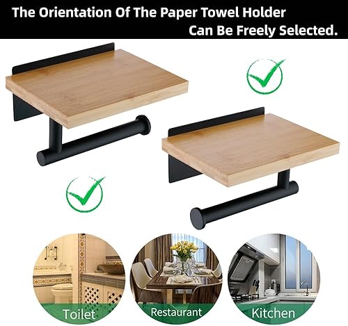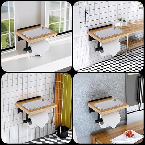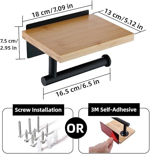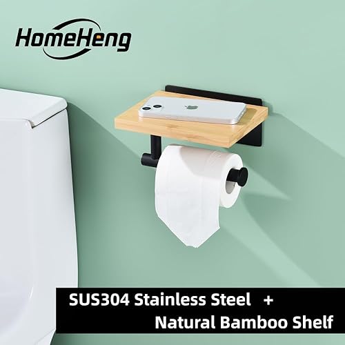 HomeHeng Toilettenpapierhalter mit Natürlichem Bambus Ablage Klopapierhalter Edelstahl Ohne Bohren Klorollenhalter Selbstklebend oder Wandmontage,Gebürsteter Nickel H98903BN