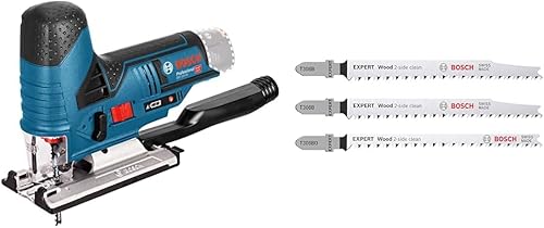 Bosch Professional Stichsäge GST 12V-70 (2x Sägeblatt, ohne Akkus Ladegerät) + 3x Sägeblatt Set Expert ‘Wood 2-Side Clean‘ (für Sperrholz, Massivholz-Möbelplatte,117 mm, Zubehör)