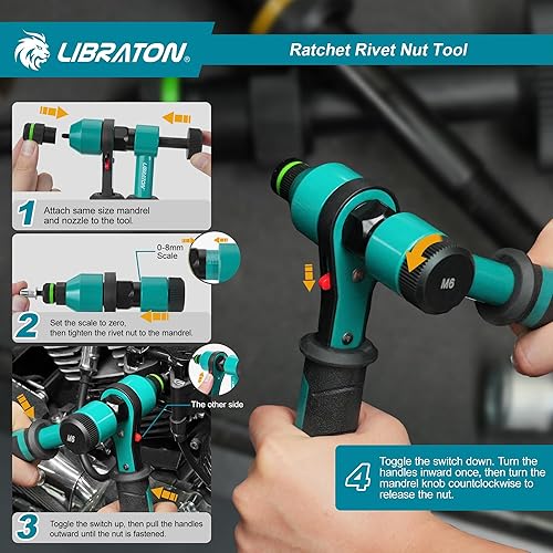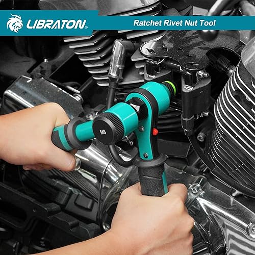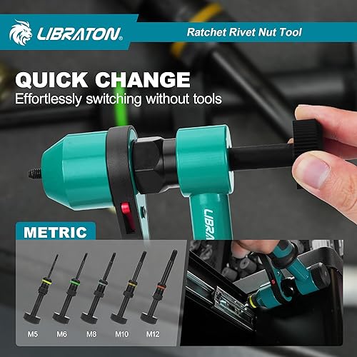 LIBRATON Nietmutternzange, Nietmutternzange Set, Profi Nietmutternratsche, Nietmutternpistole mit 5 Metrischen Dornen, 5 Mutternköpfen, 50 Nietmuttern, Tragebox, Einnietmutternzange für Autoreparatur